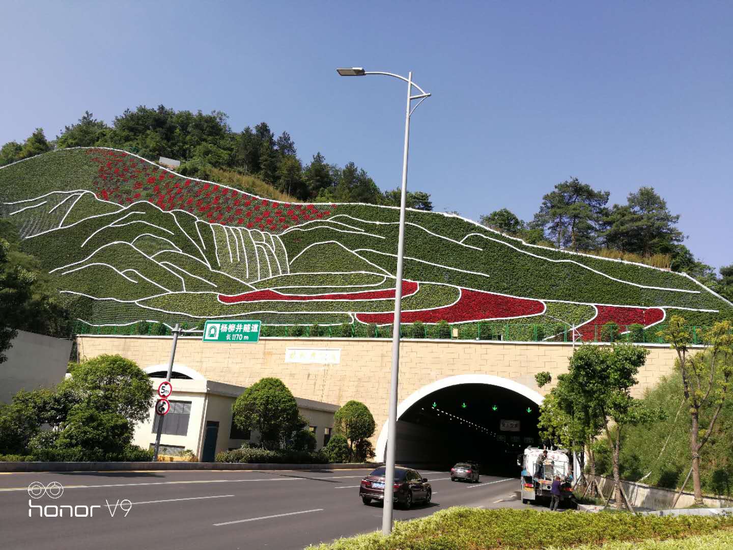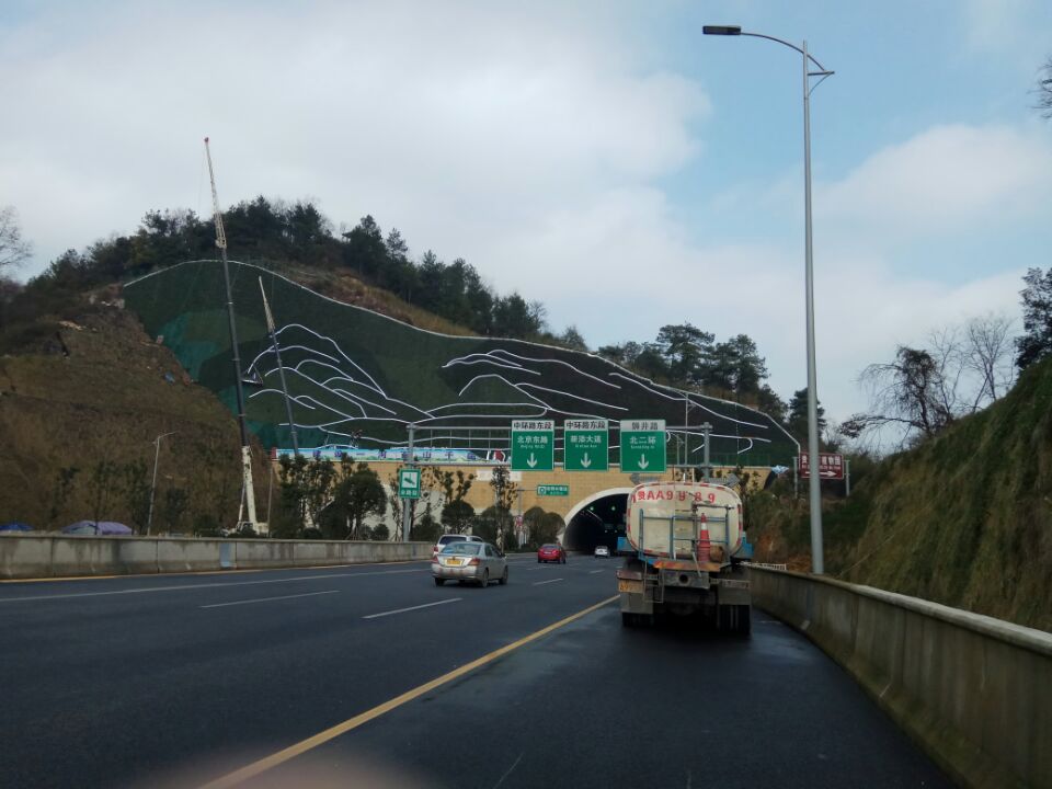 3、隧道口上方邊坡運(yùn)用國畫中白描手法將貴州獨(dú)特的山、水、田園風(fēng)光巧妙的融為一體,運(yùn)用不同色彩的植物劃分,塑造層次豐富,立體感的垂直綠化景觀。